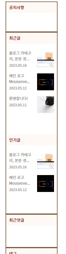 최근글/인기글 분류는 위의 태그를 이용해 분리해주면 될 것 같다